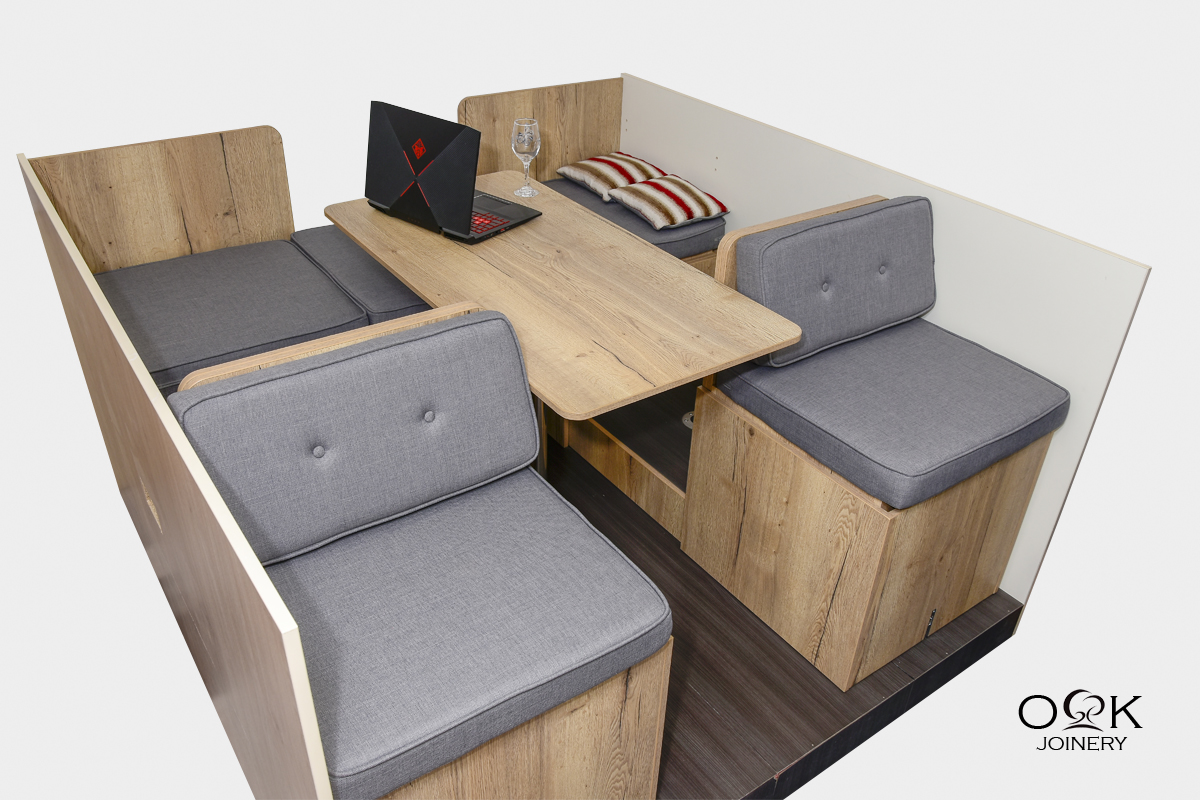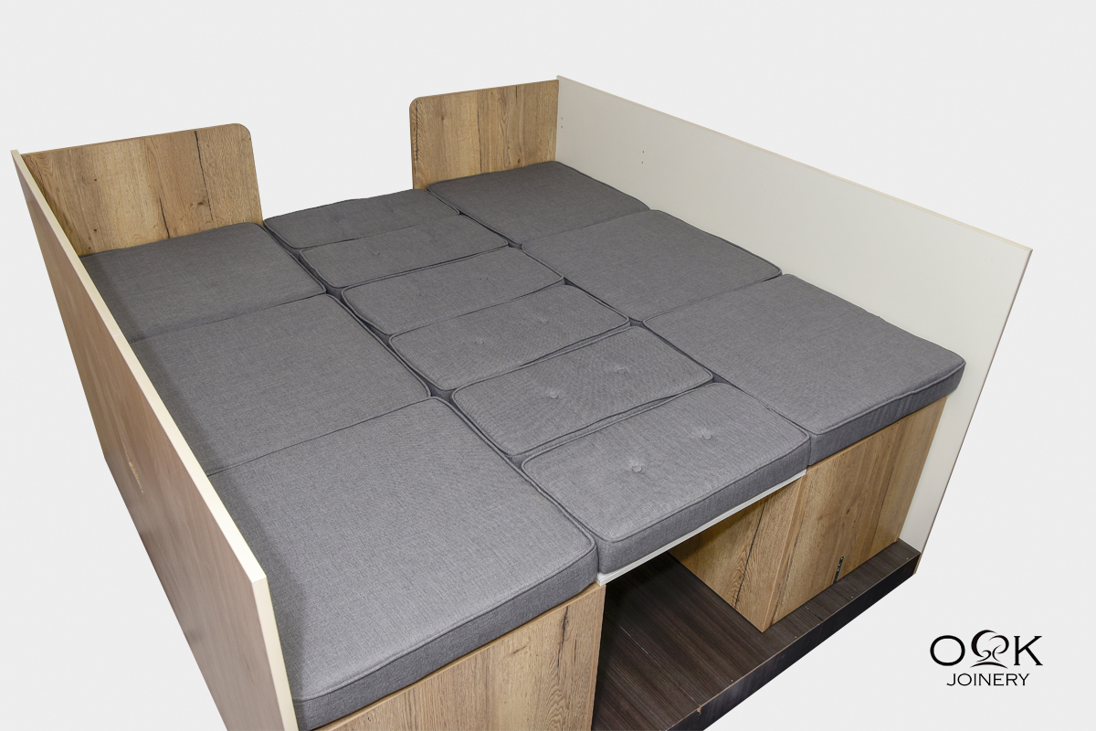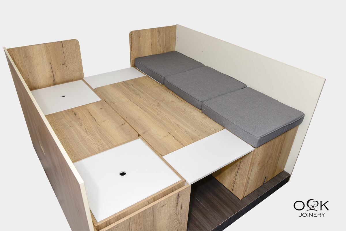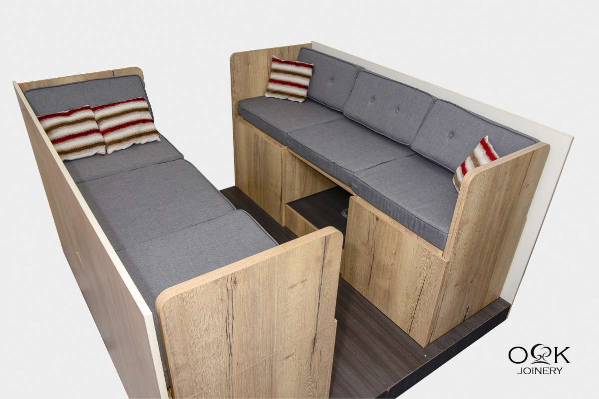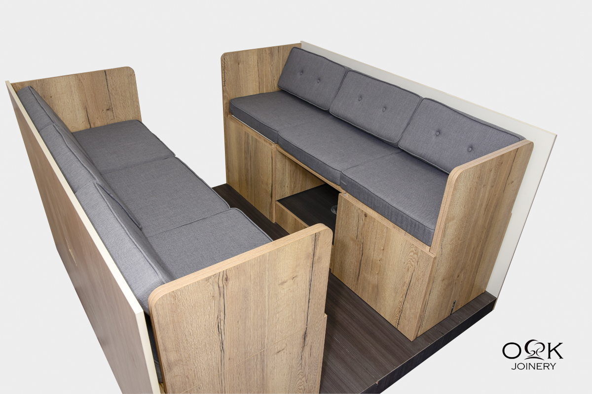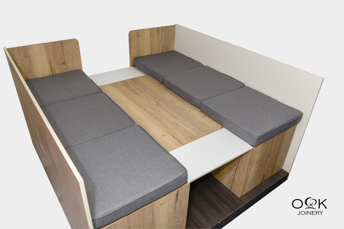 Small spaces need to be carefully curated. The furniture selected must reflect individual tastes and consider personal preferences. As with our dinette collections, OK Joinery multifunctional furniture is entirely customisable. Select from a wide variety of woodwork and cushion colours and we will deliver a bespoke piece that complements your living-space interior.