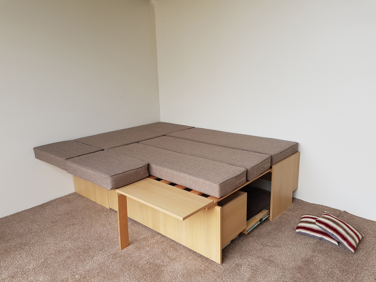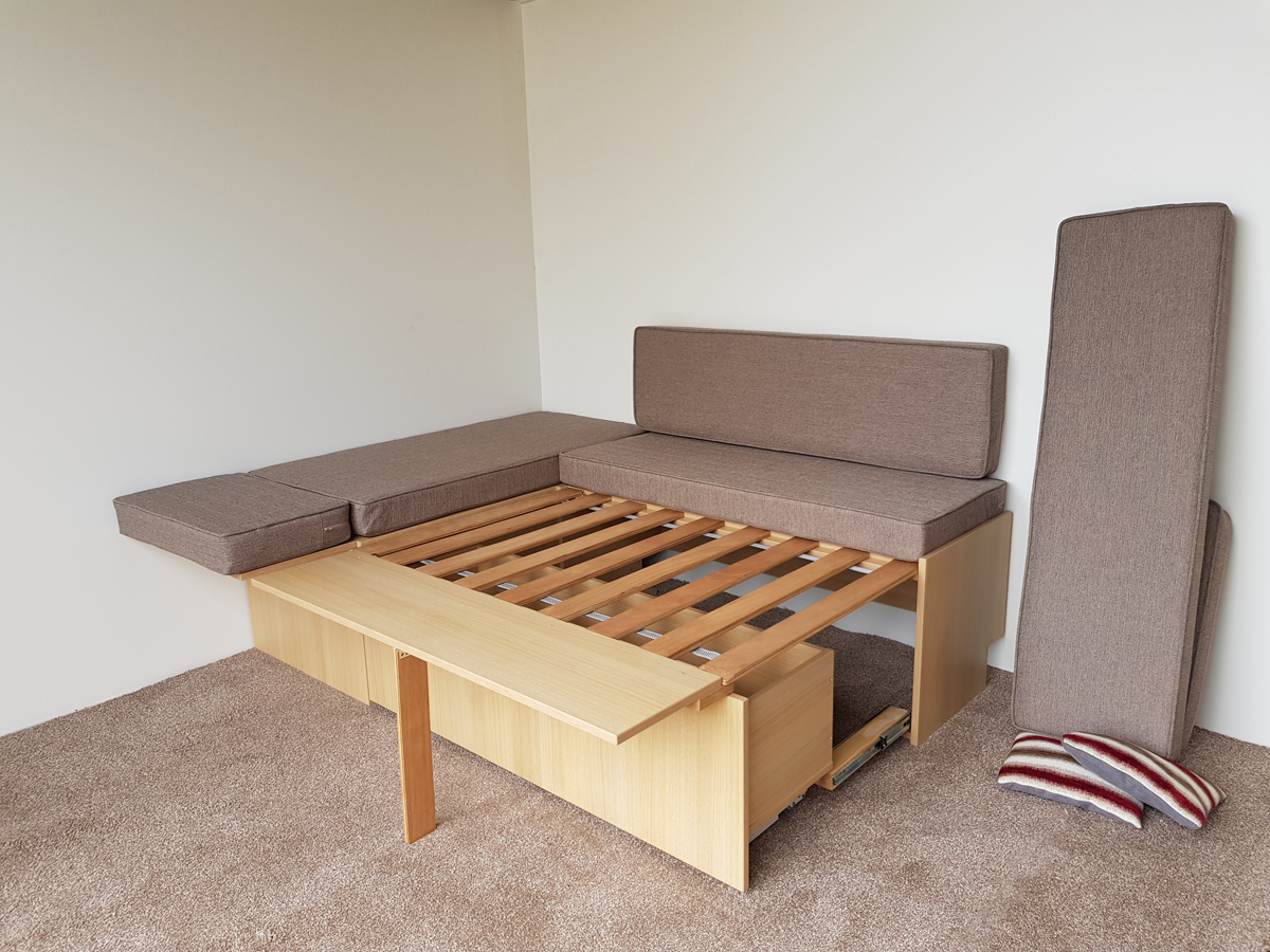 Our Extra Wide L-shape 6-in-1 Dinette is a multi-purpose masterpiece, converting smoothly from a corner sofa or 4-seater dining set to an extra large double bed. This 3-in-1 solution highlights our innovation in space-saving narrowboat furniture.