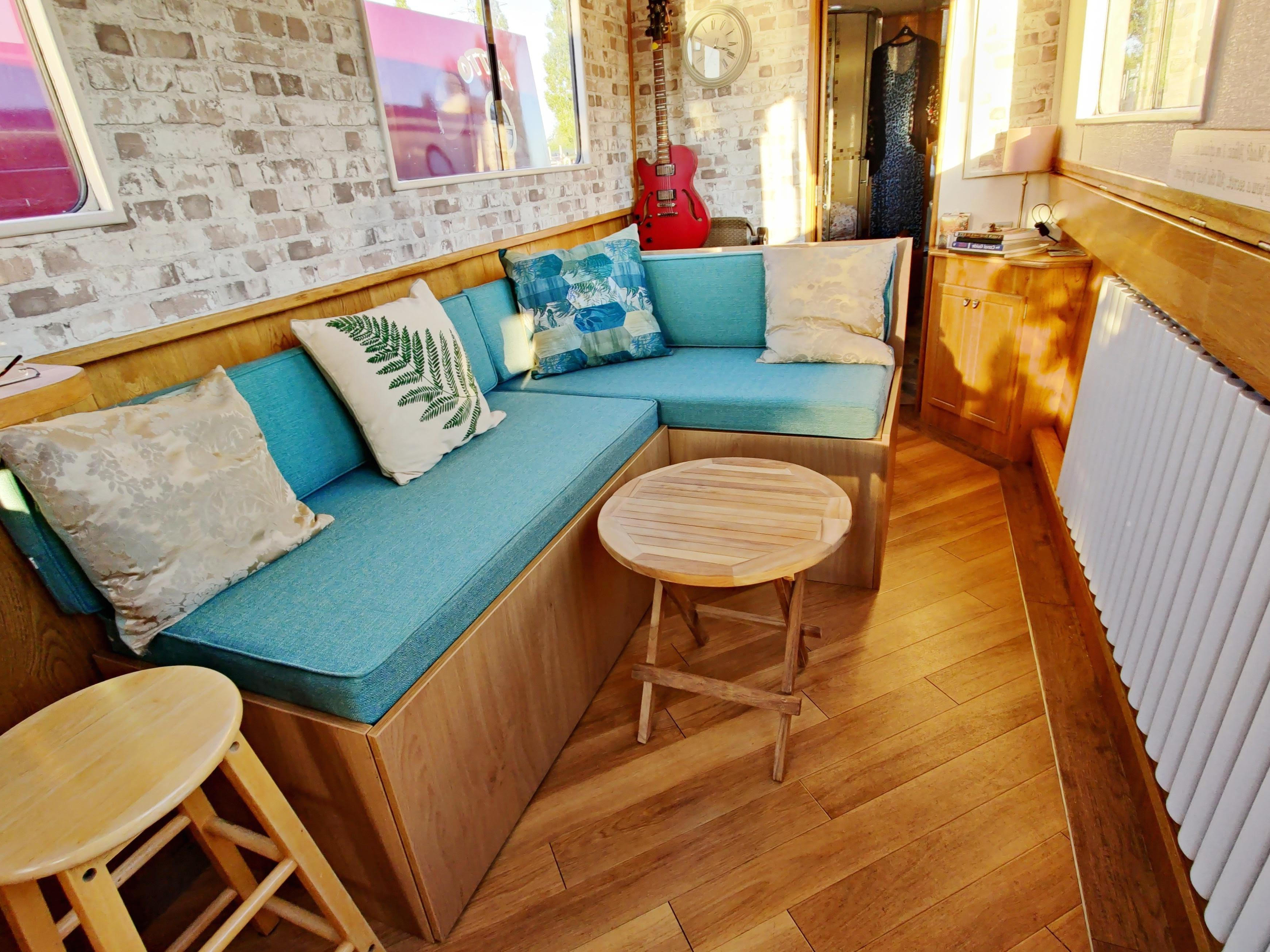 Unleash the potential of your narrowboat with our customisable L-shape Dinette, a staple for narrowboat and canal boat interiors. This marine furniture piece transforms from a corner sofa or a 4-seater dining set into a double bed with ease, offering a seamless blend of style and functionality. Complete with concealed storage under the seating area, the L-shape Dinette is an essential addition to your small boat furniture collection, tailored to your tastes with a variety of materials and colours.
