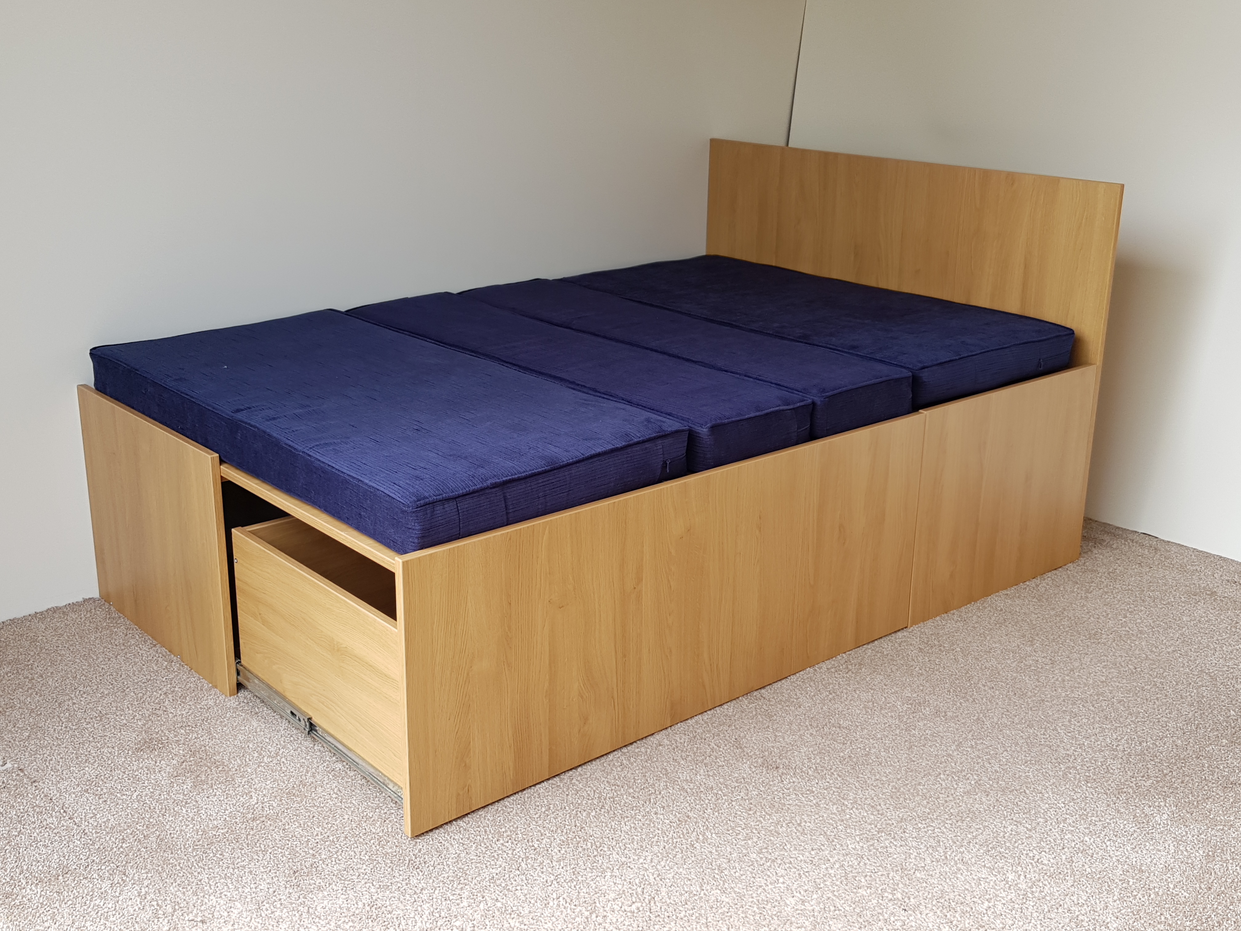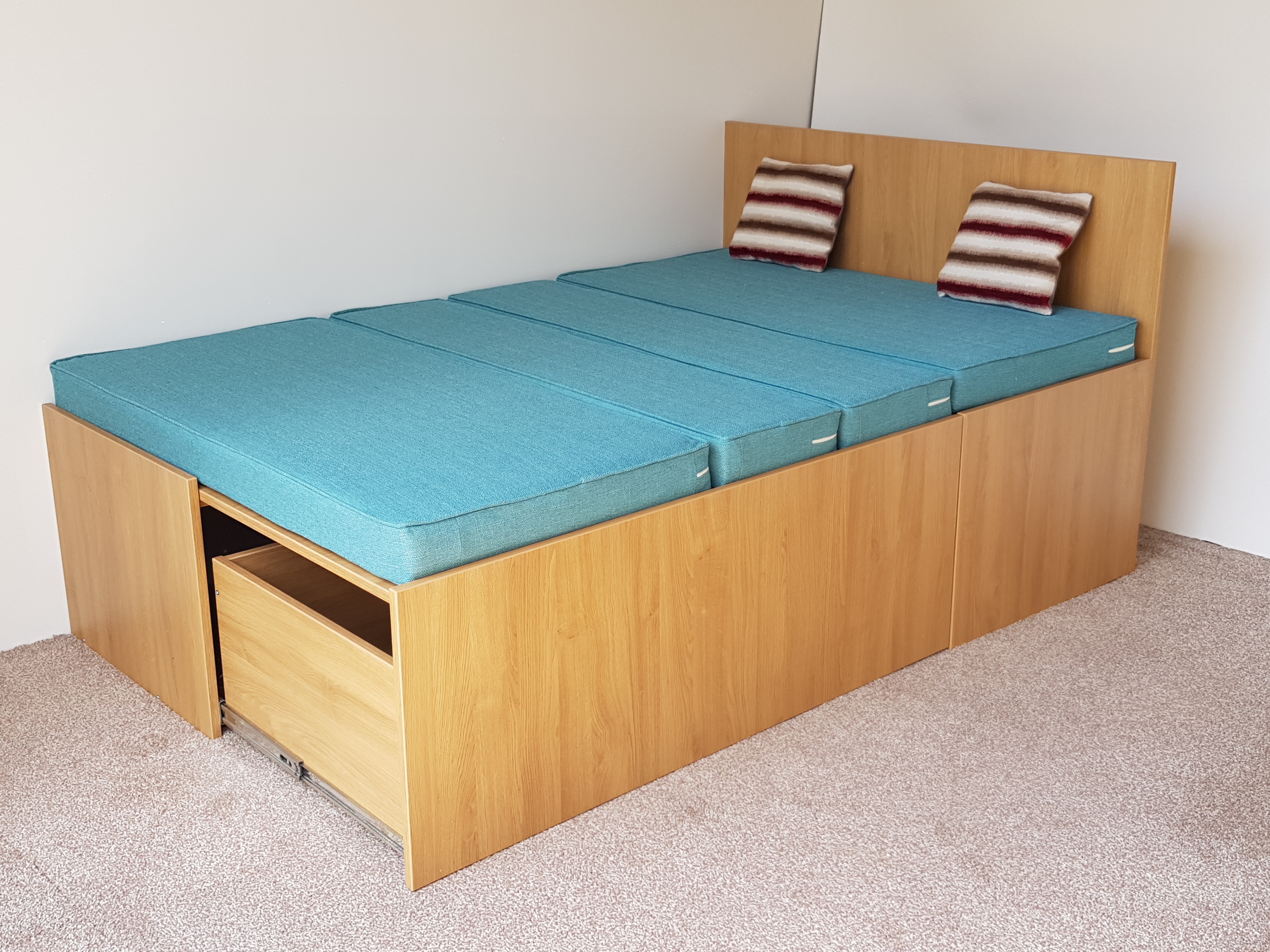 Our L-shape Dinette is a multipurpose masterpiece, converting smoothly from a corner sofa or 4-seater dining set to a large double bed. This 3-in-1 solution highlights our innovation in space-saving narrowboat furniture.