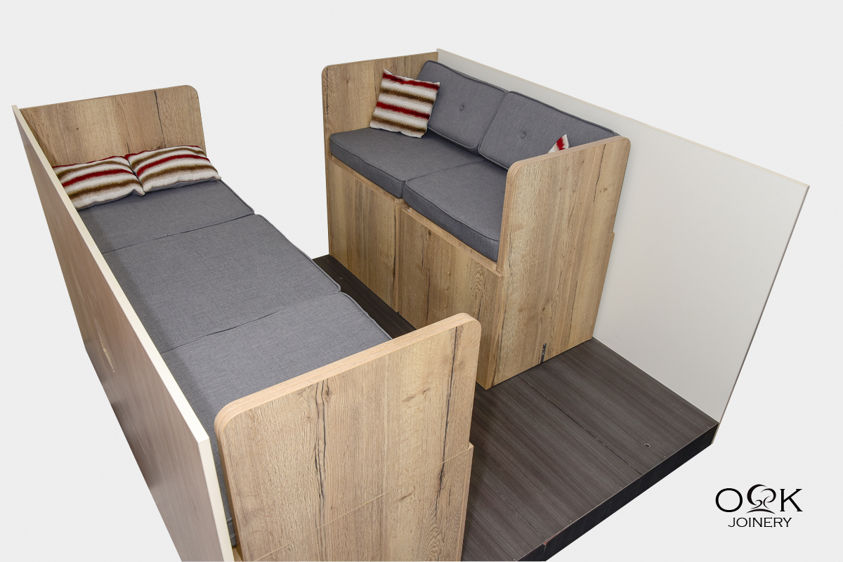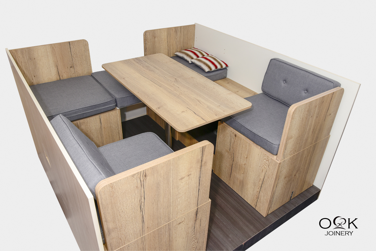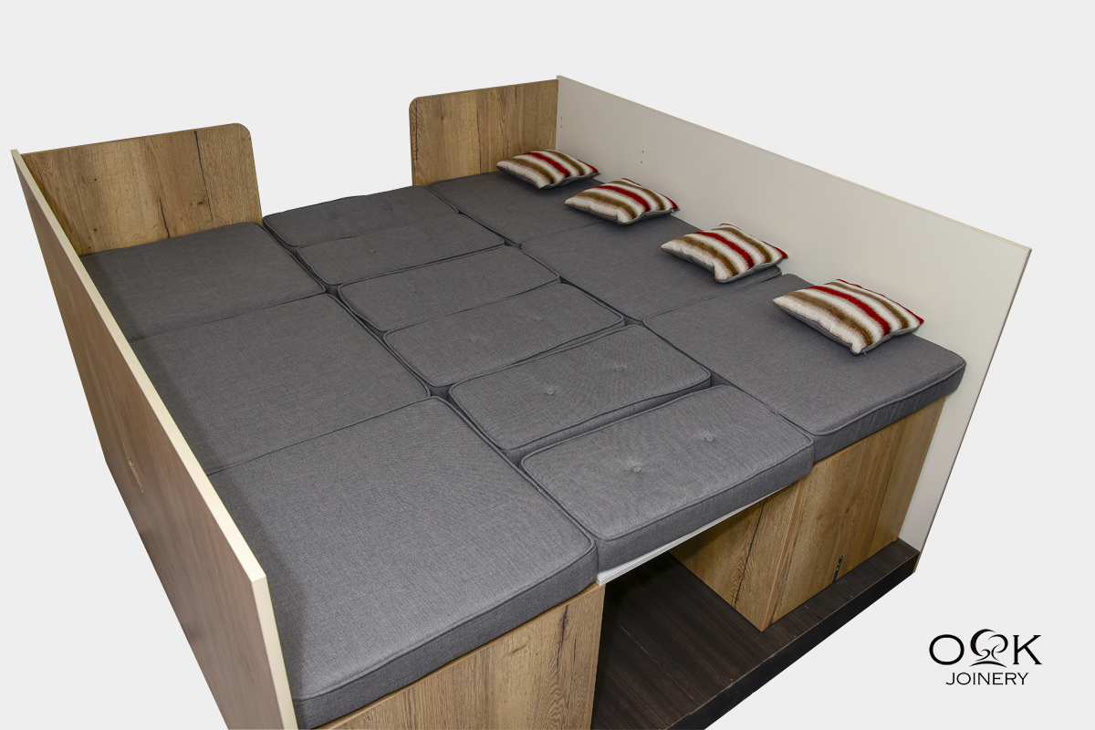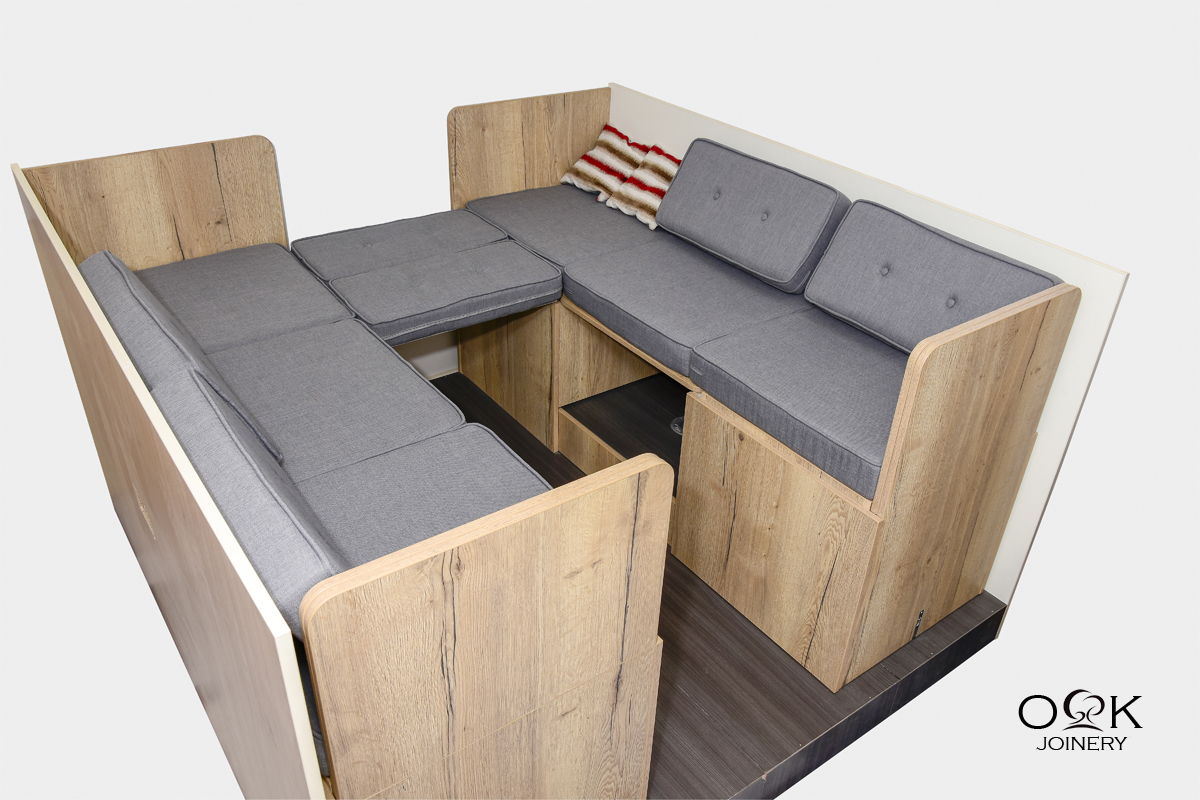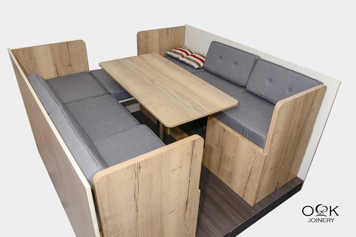 Small spaces need to be carefully curated. The furniture selected must reflect individual tastes and consider personal preferences. As with our dinette collections, OK Joinery multifunctional furniture is entirely customisable. Select from a wide variety of woodwork and cushion colours and we will deliver a bespoke piece that complements your living-space interior.