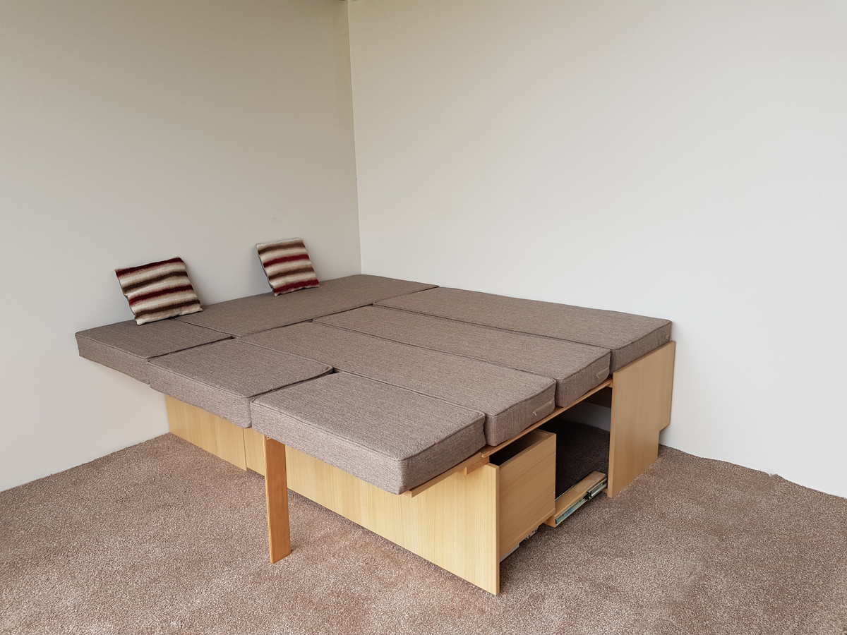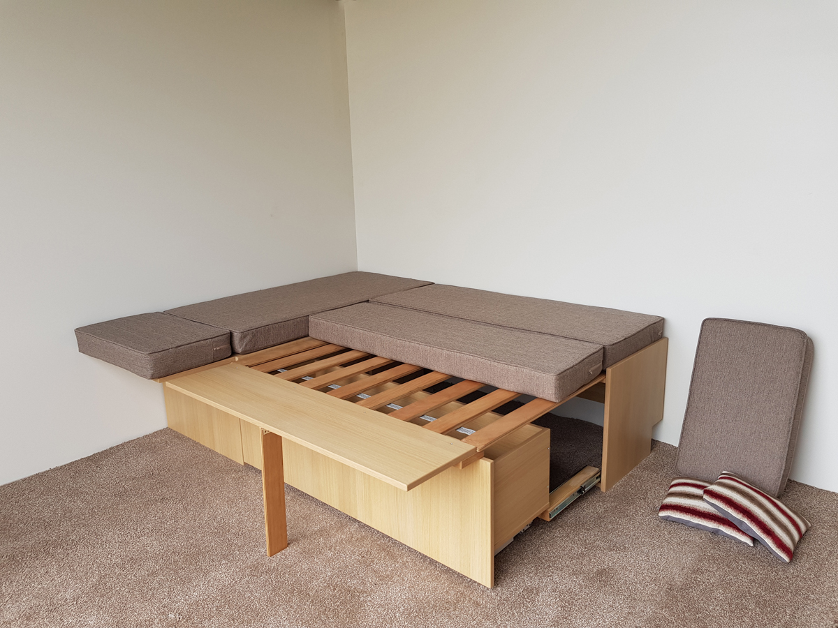 Our Extra Wide L-shape 6-in-1 Dinette is a multi-purpose masterpiece, converting smoothly from a corner sofa or 4-seater dining set to an extra large double bed. This 3-in-1 solution highlights our innovation in space-saving narrowboat furniture.